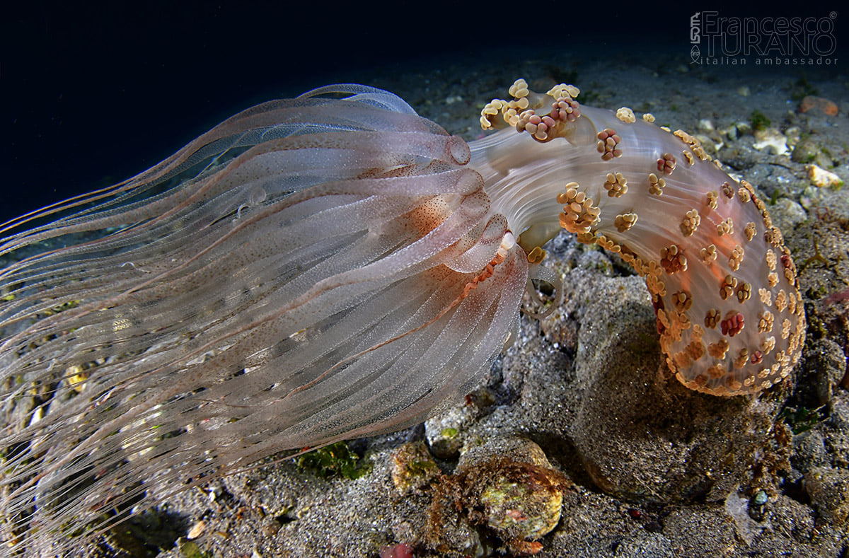 Questa incantevole attinia definita "Reggina della notte" con il buio espande il suo corpo cilindrico gonfiandosi di acqua ingrandendosi fino a venti volte rispetto alle dimensioni mantenute durante le ore diurne , dall'estremità apicale si diramano una serie di lunghissimi tentacoli sottilissimi ed urticnti che fluttuando con la corrente raccolgono il nutrimento. Predilige fondali detritici e con forti corrrenti.